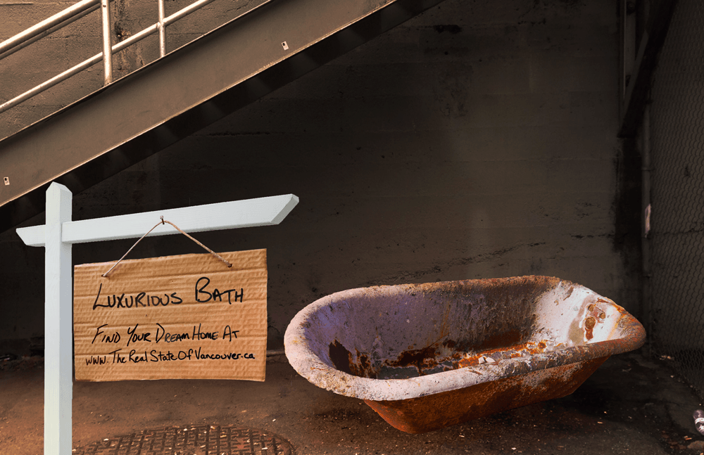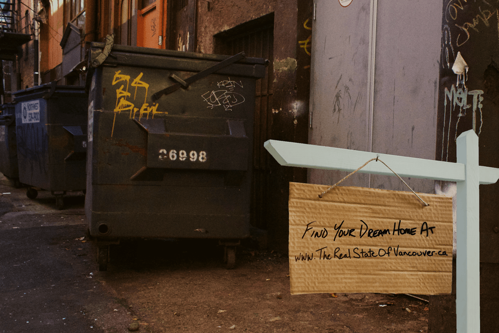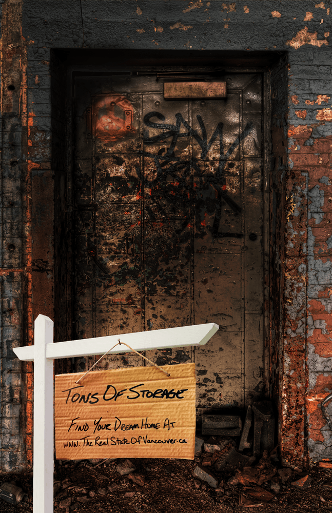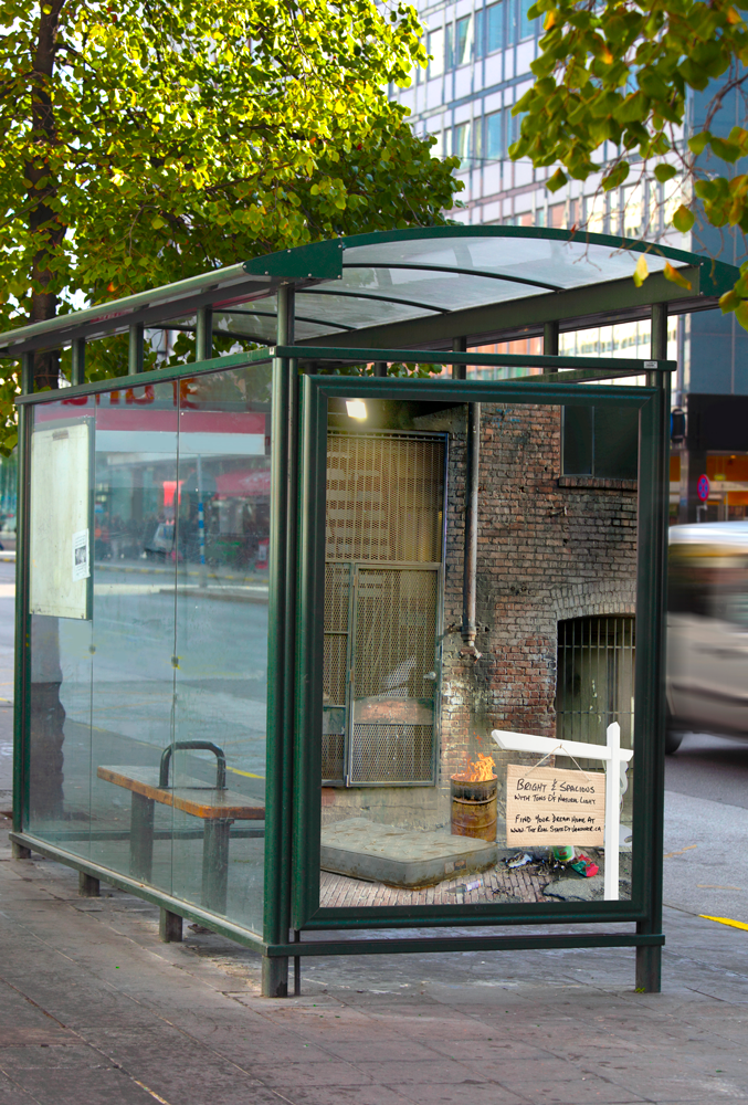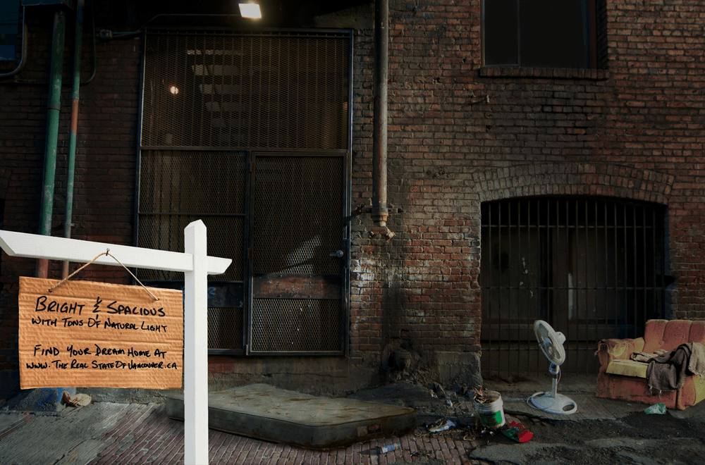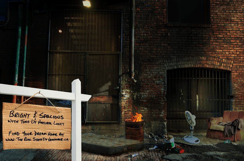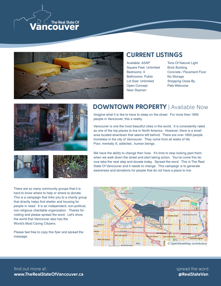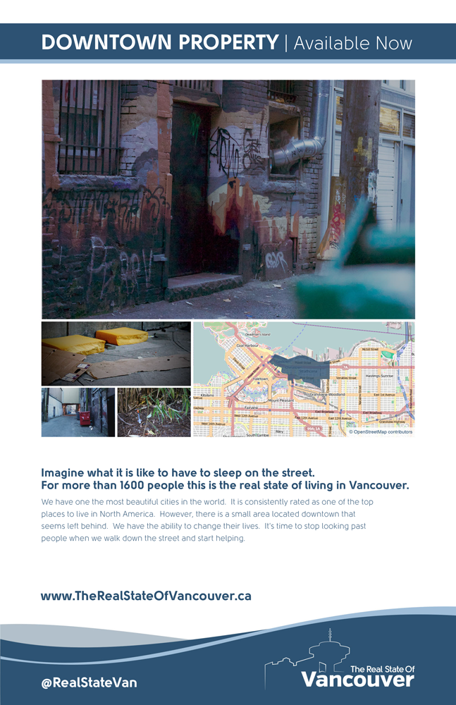 "The Real State of Vancouver" was my grad project creating an advertising campaign to fundraise for a non-denominational homeless shelter. It was a take off on the high-priced real estate property and the juxtaposition of million dollar high-rise condos with people sleeping on the streets below.