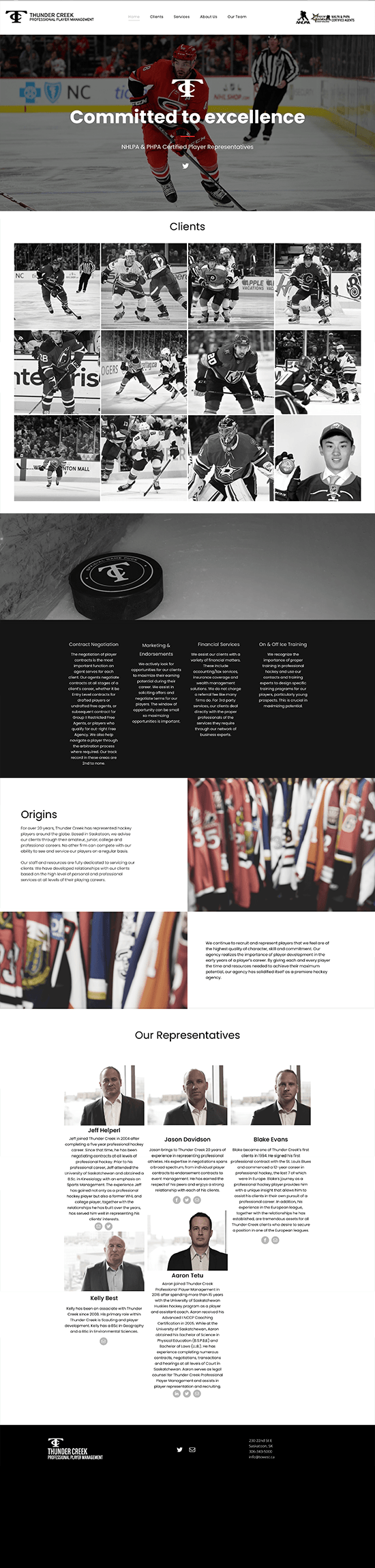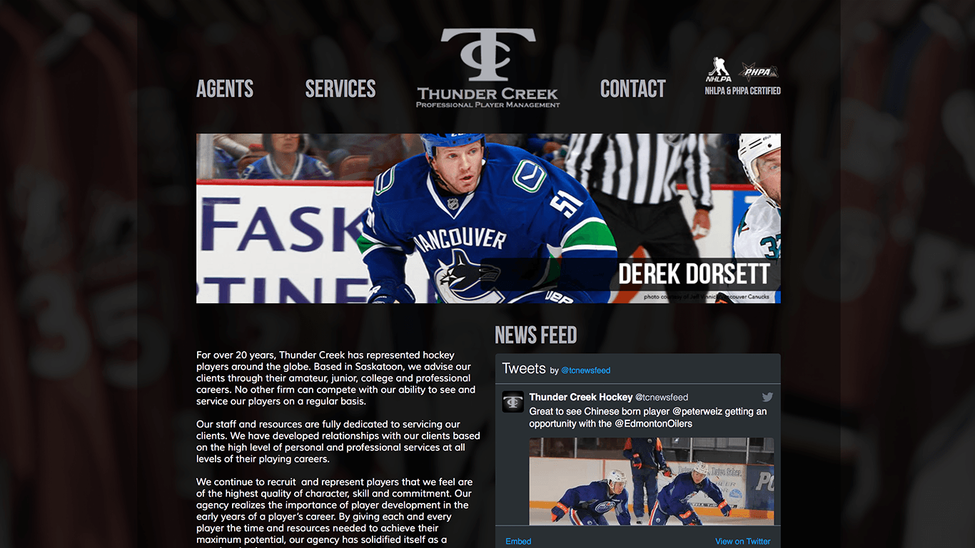 Thunder Creek Professional Player Management is a sports agency group located in Saskatoon, SK. I have worked with them as a contracted consultant to train their athletes and I have worked with them in a design capacity. Initially I built a site for them on Adobe Muse then switched over to another builder. I also removed a ring from around their logo to give them a sleeker modern look and feel.
